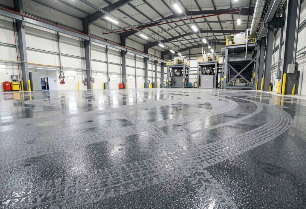 Shark grip or polymer additives — mixed directly into the topcoat rather than broadcast on top. Produces a more consistent texture that’s easier to clean. Popular in food processing and pharmaceutical environments but increasingly used in general manufacturing.