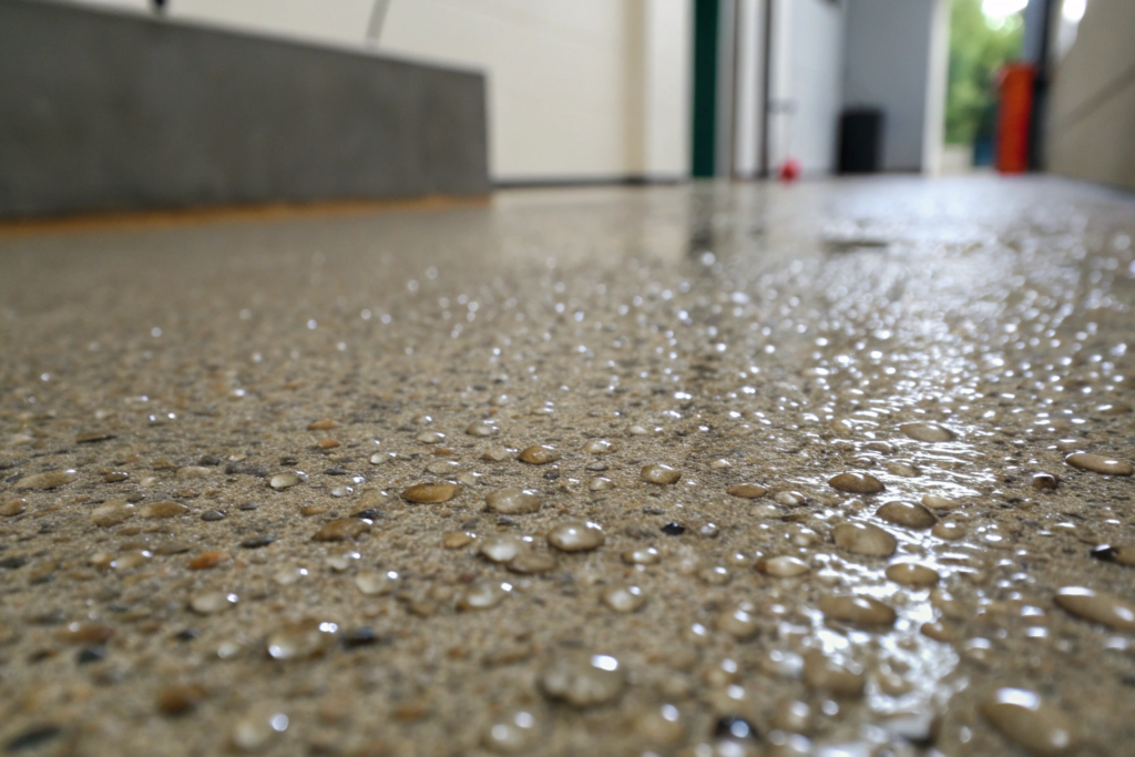 Aggregate wear is gradual — most property owners don’t notice it until grip is already compromised. Watch for smoothing of the surface texture, increased shine, or a slippery feel in wet conditions. Commercial surfaces typically need recoating every 5–7 years. Residential slip resistant flooring in wet areas generally lasts 7–10 years before a refresh is needed. A local contractor inspection can confirm where your floor sits.