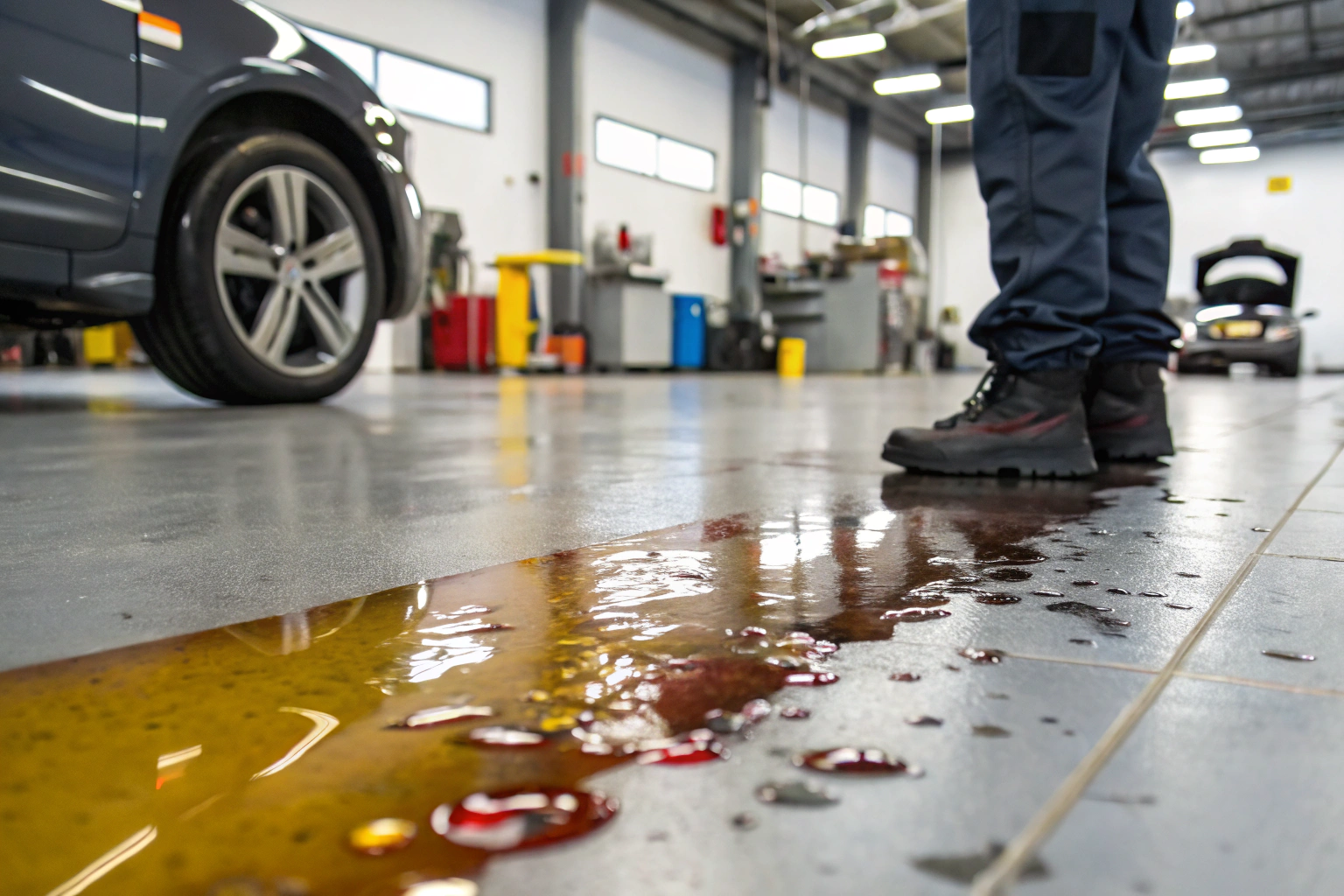 Automotive environments demand flooring that survives constant chemical exposure, heavy impacts, and vehicle traffic that destroys standard concrete within months. Professional epoxy creates an impermeable barrier where spills sit on the surface until cleanup instead of penetrating and staining permanently.